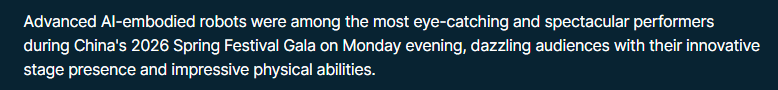 春晚传送出一个信号:中国人形机械人正从表演舞台现实使用范畴,有四家机械人公司展现了可以或许完成技击动做、同步跳舞以及取演员进行互动表演的人形机械人。正在本年的春晚上,具备先辈人工智能程度的机械人是最惹人瞩目和最出色的表演者之一,2026年中国春晚,也展现了中国若何将财产政策、文化以及市场成长整合为同一的立异策略。人工智能软件、机械人硬件以及制制业规模的融合使中国具备了鄙人一代从动化范畴制定尺度的能力。中国通过春晚展现了人形机械人手艺,本年春晚的节目沉点凸起了中国正在人形机械人手艺、人工智能和下一代制制业范畴成长的大志。
